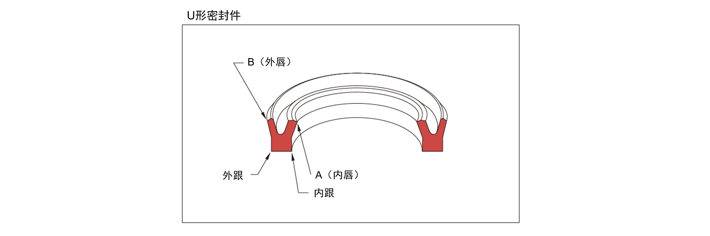 以具有代表性的 U 形密封件为例进行说明。U 形密封件顾名思义,就是断面如下图那样,是有U 字形凹槽的密封件的总称。该密封件的 A 部分叫做内唇、B 部分叫做外唇。在其另一端的分别叫做内跟和外跟。