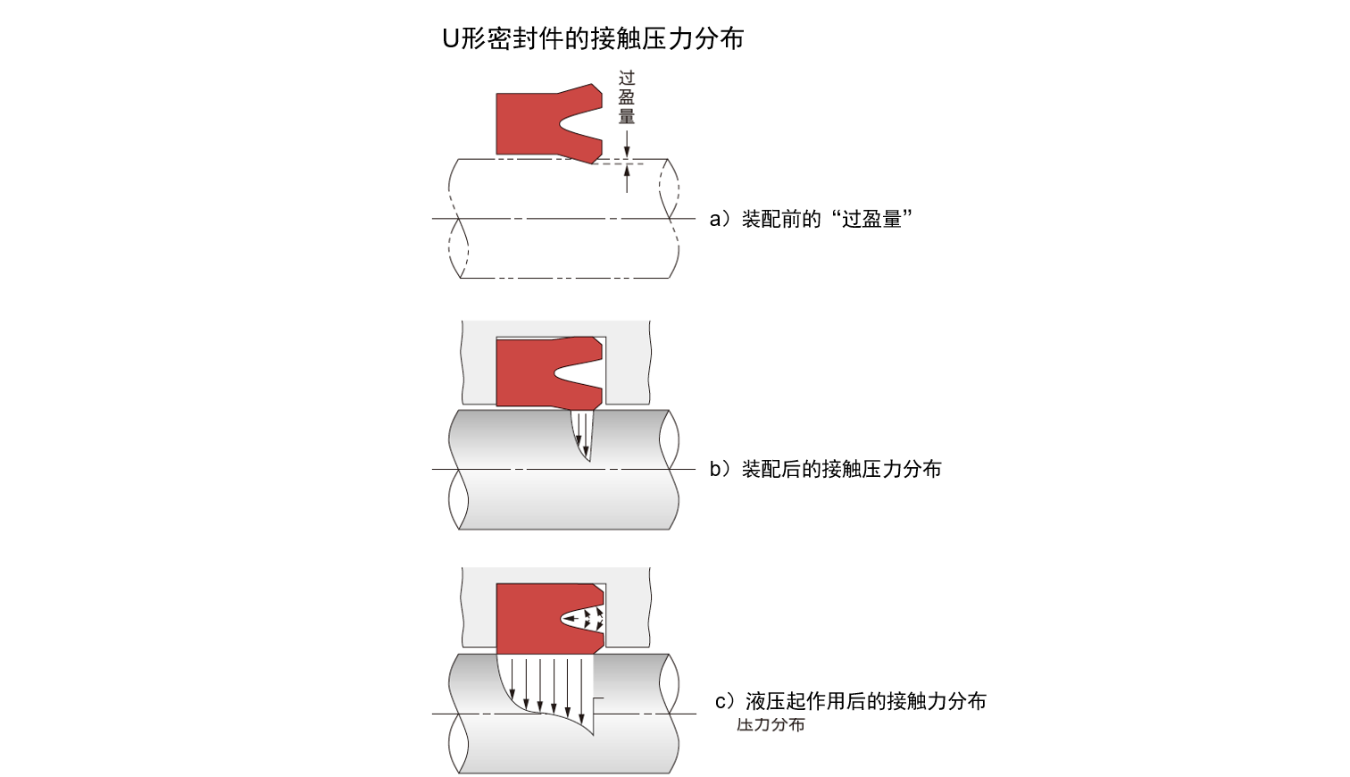 U形密封件装入沟槽后,就如图下图那样,只有“过盈量”的部分会变形,使得唇部与活塞杆相接触。再加上液压(油压)的话,会一直变形到 U 形密封件的跟部,这样,整个滑动面就会和活塞杆表面进行密切接触。这个唇部和跟部的接触压力分布情况与唇形密封件的密封特性紧密相关。