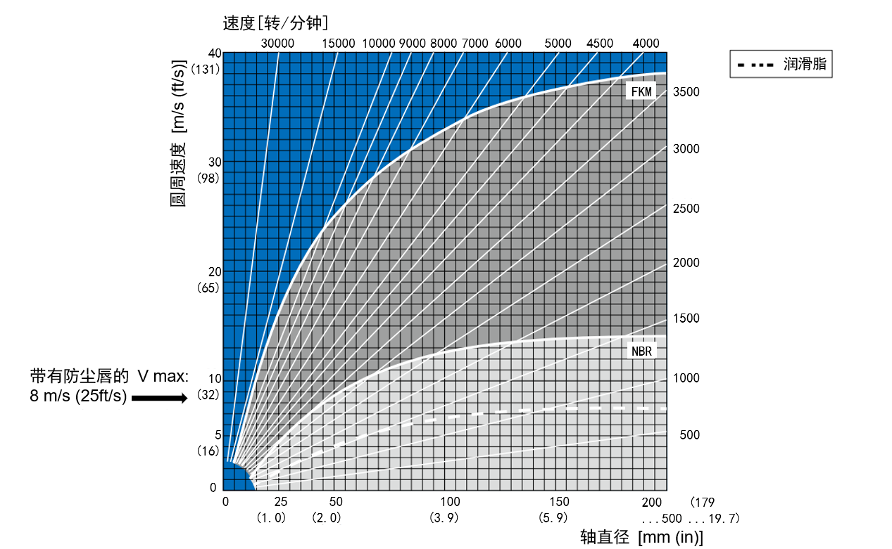 使用 SAE20 密封机油时,材质为 NBR(72 NBR902)及 FKM(75 FKM585)的骨架油封允许圆周速度。