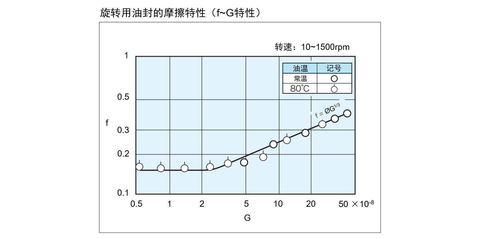 从下图可得到油封的形状及由使用条件所决定的无量纲特征数G与此时的摩擦系数 f 间的关系。