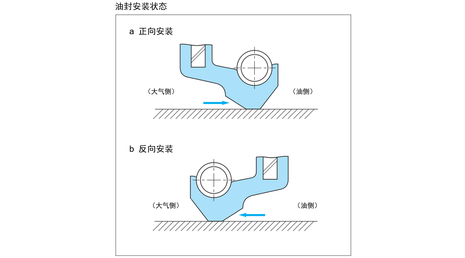 下图中,a是正向安装时油的密封状态,也就是大气被送入油侧的状态,b是反向安装时油向大气侧泄漏的状态。