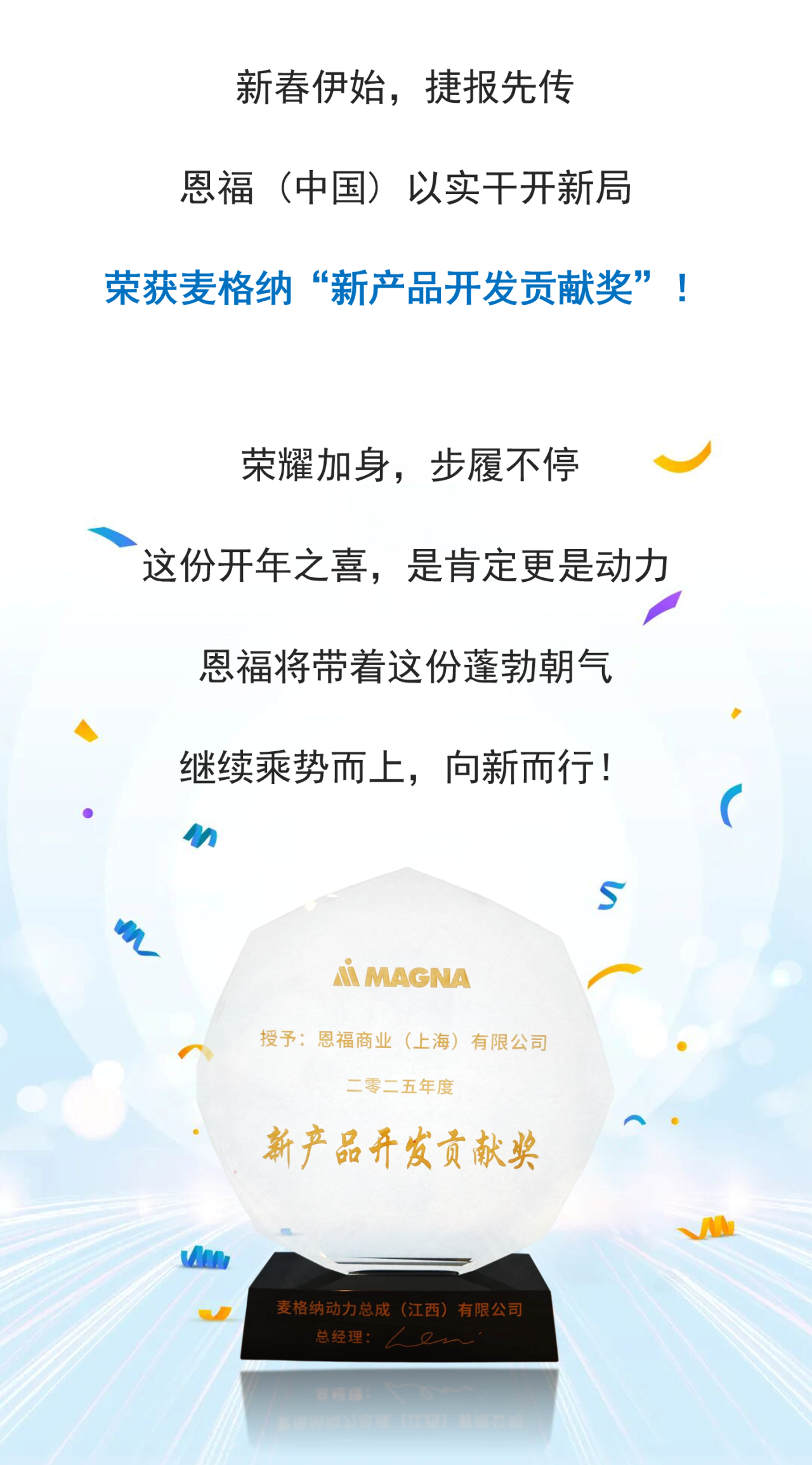 近日,恩福 (中国) 凭借在项目研发过程中的专业技术实力以及高效的协同配合,荣获麦格纳动力总成(江西)有限公司颁发的2025年度“新开发贡献奖”!