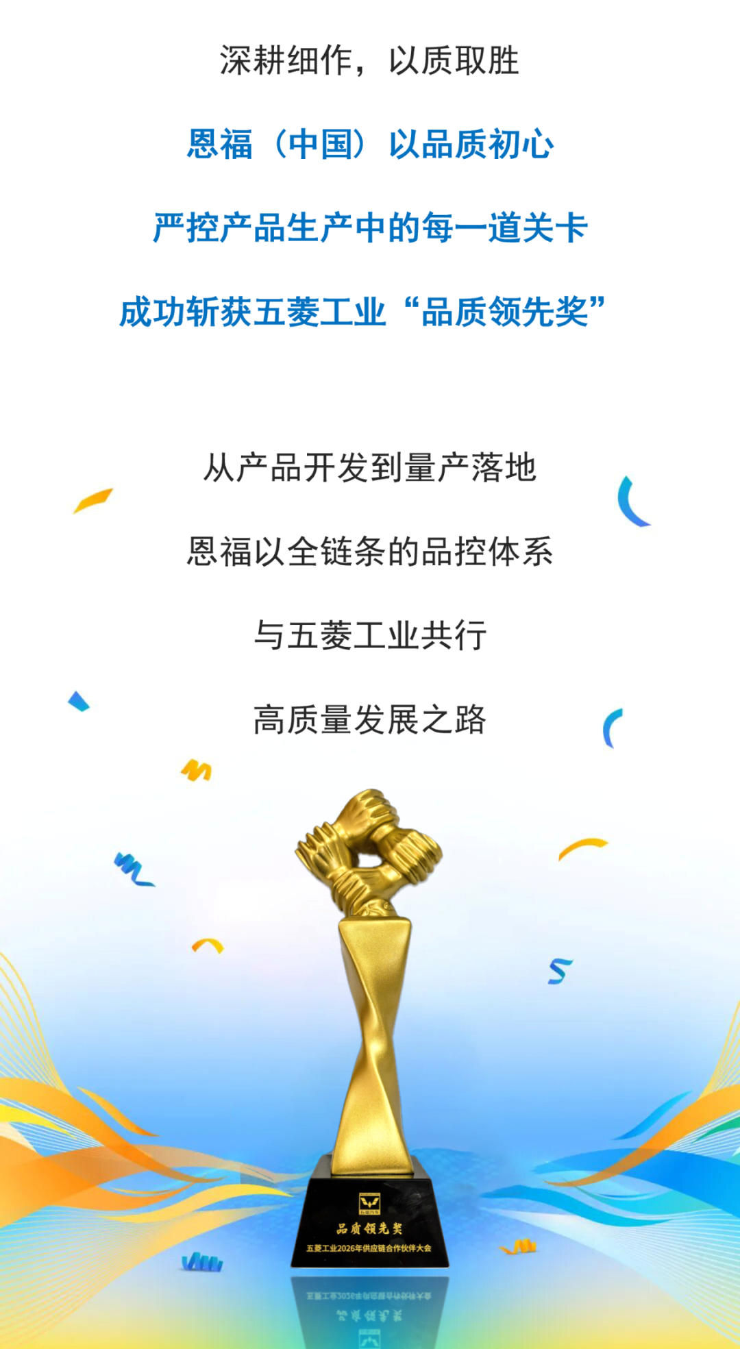 恩福 (中国) 受邀出席本次大会,并凭借稳定的交付能力与卓越的产品品质,荣获五菱工业颁发的“品质领先奖”!