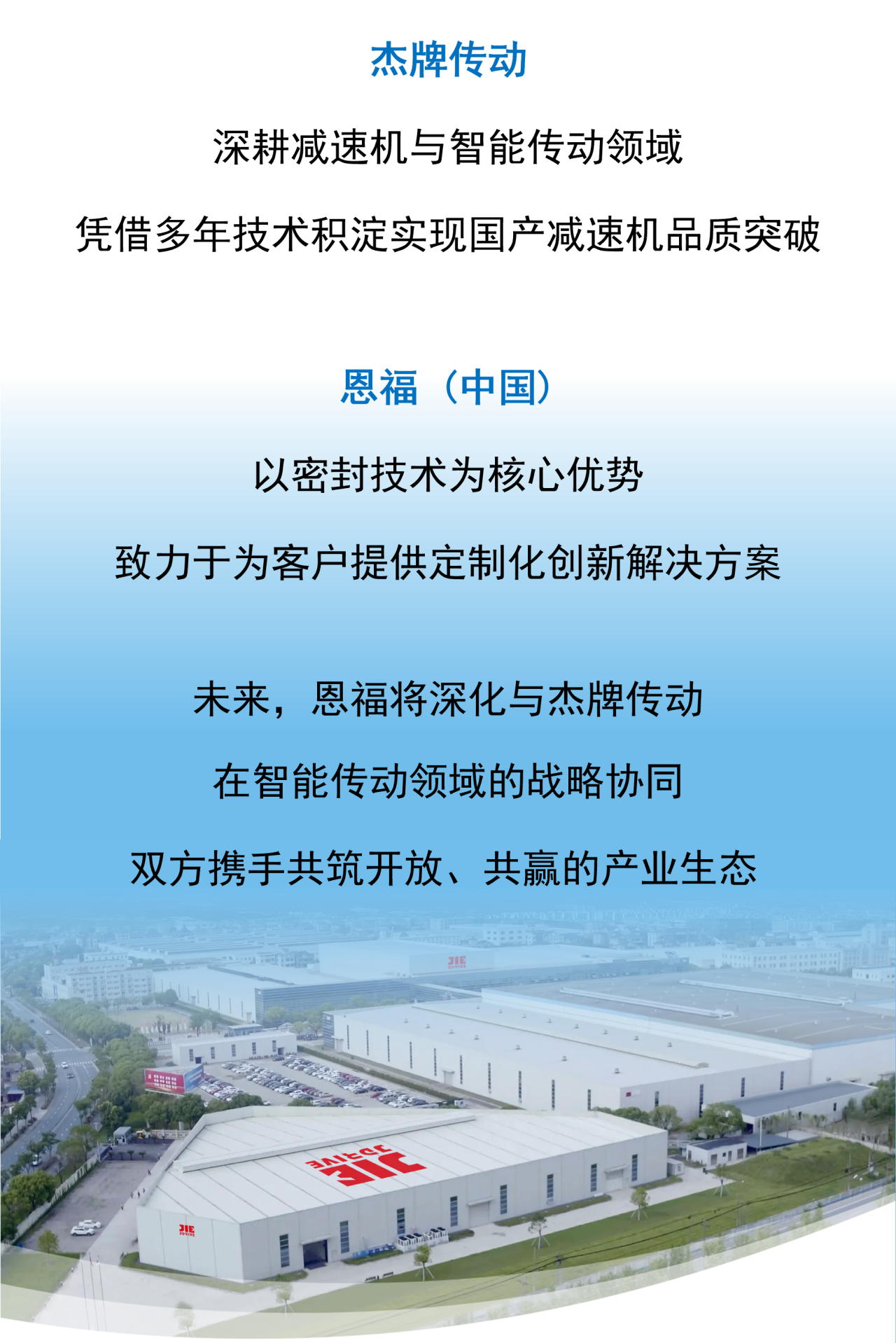 未来,恩福将深化与杰牌传动在智能传动领域的战略协同,通过持续精进的技术研发,进一步提升密封产品在多样化工业场景中的稳定性与适配能力,为杰牌传动加速拓展全球市场提供密封件技术与产品支持,双方携手共筑开放、共赢的产业生态。